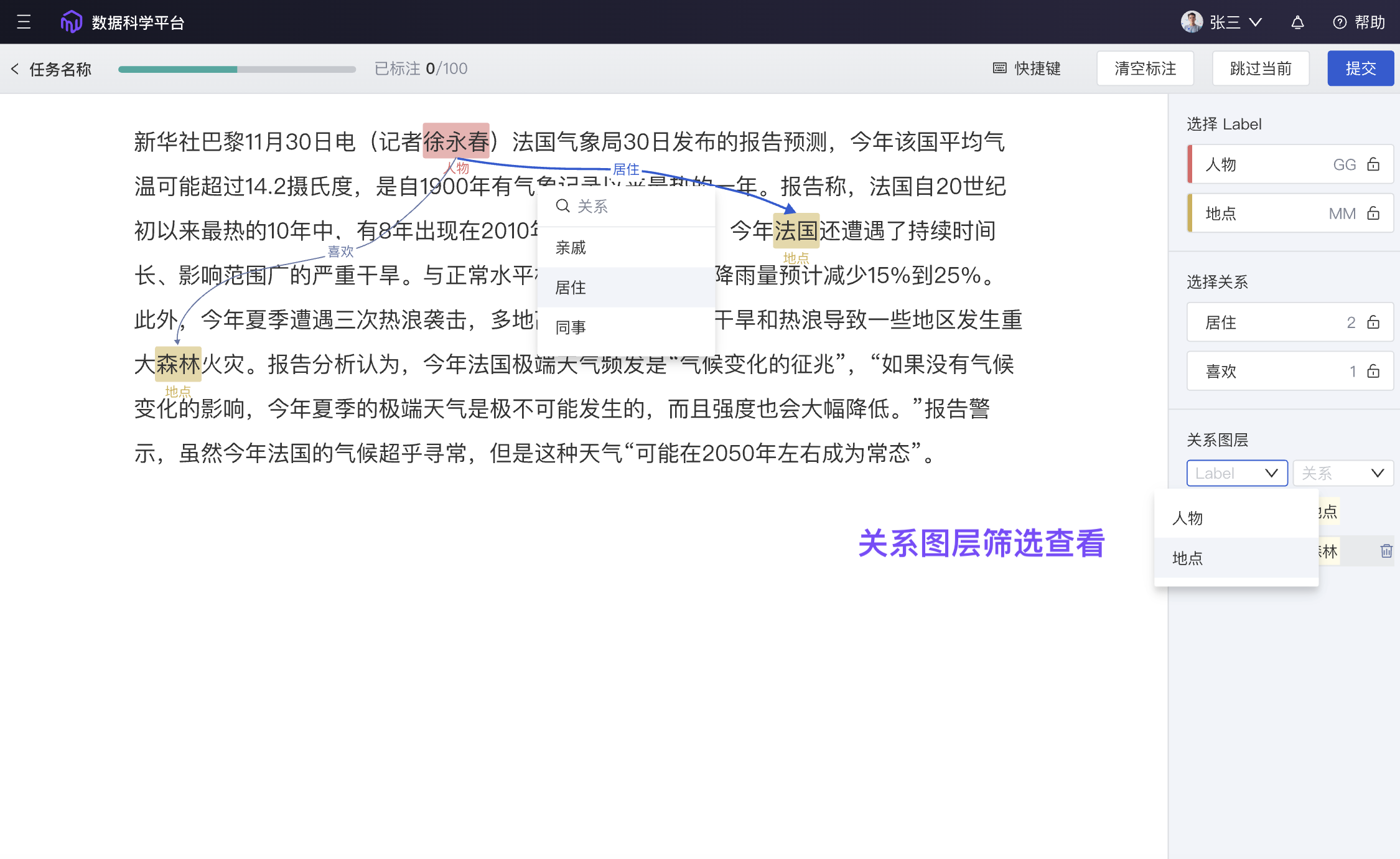 ModelWhale 标注工具,新增“关系抽取”的文本标注类型:支持构建满足知识图谱的“实体 - 关系 - 实体”三元组,提取高质量知识及知识间关联关系,从而提升大模型在搜索阶段的效果和效率。具体操作可参考用户手册:
