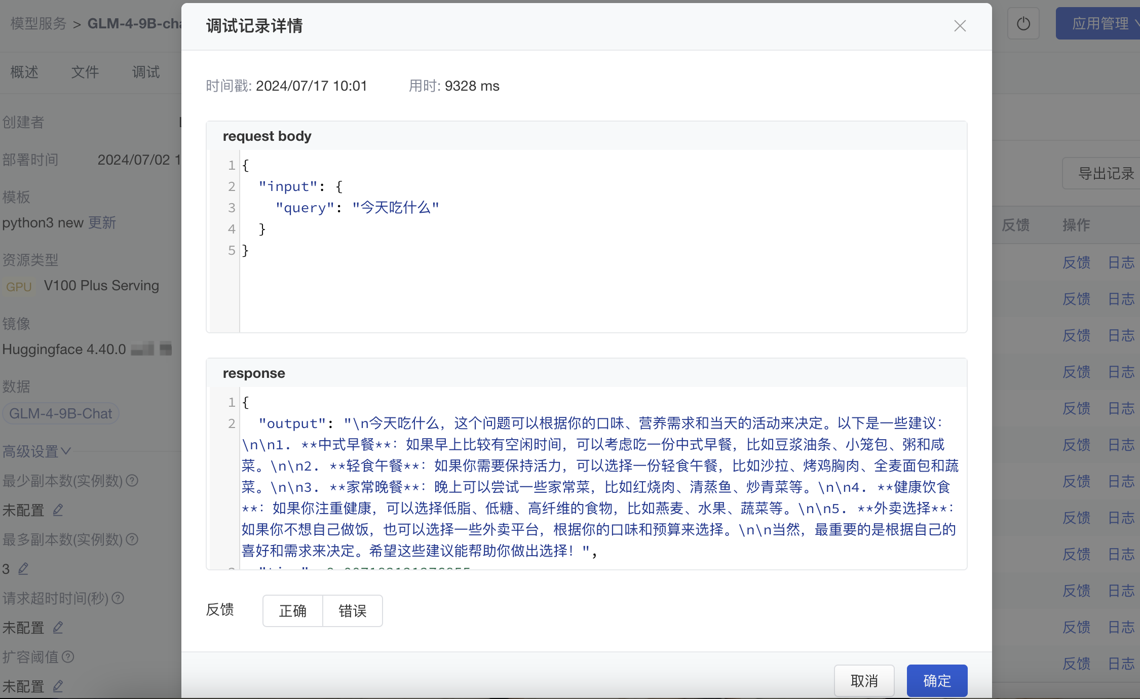 新增记录 TPM(Tokens Per Minute,每分钟输入+输出的 tokens 数量):可用于衡量模型的推理速度、评估模型在生成文本或处理输入时的效率。注:仅“生成式大模型”支持记录 TPM。