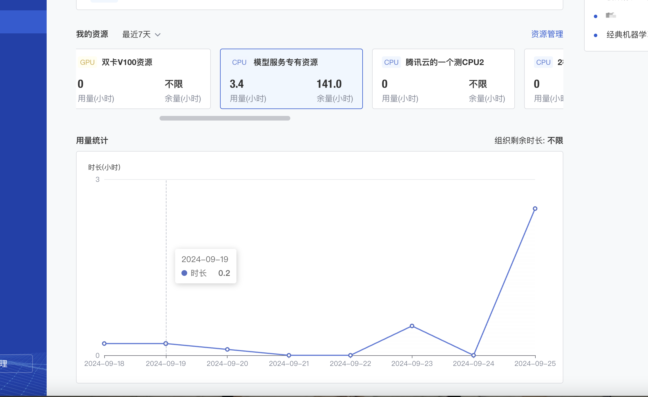 服务资源用量,支持在服务详情页监控,也支持在工作台(最近)查看统计用量。