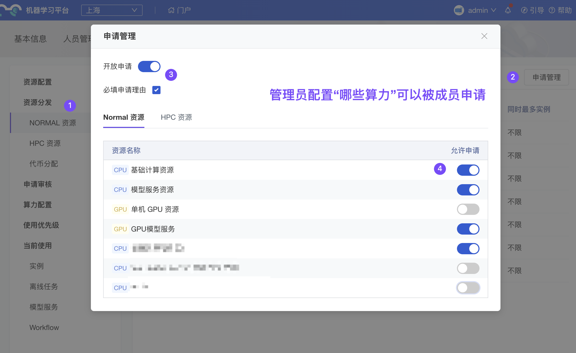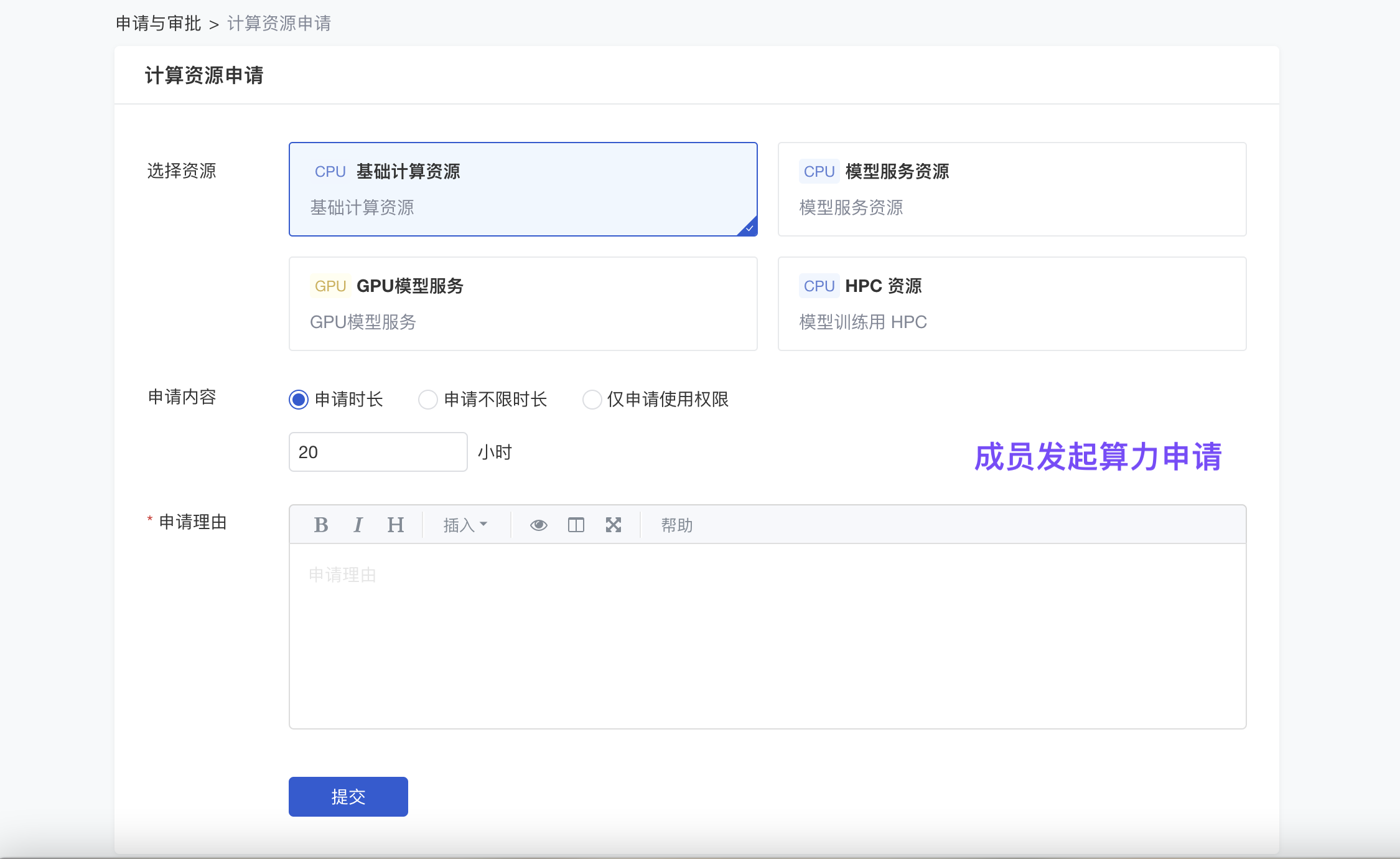 如组织成员没有某算力的使用权限、算力可用时长不足,可在线上发起申请、由管理员审批后二次下发。现已支持由管理员配置“哪些算力”可以被成员申请,实现更严格的管理。注:如管理员不希望成员自由申请资源,可关闭【资源申请】功能。