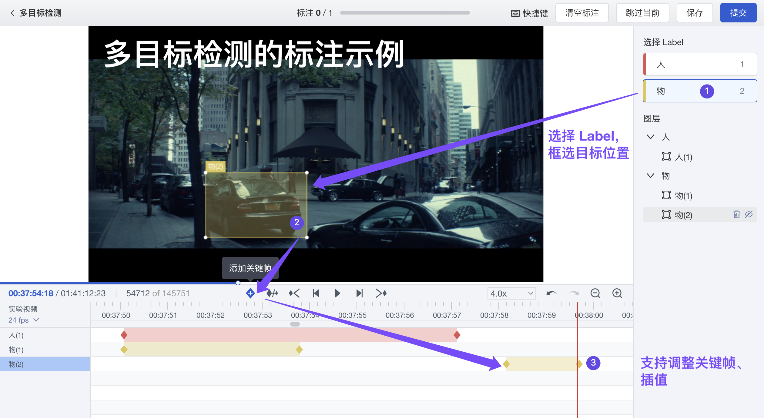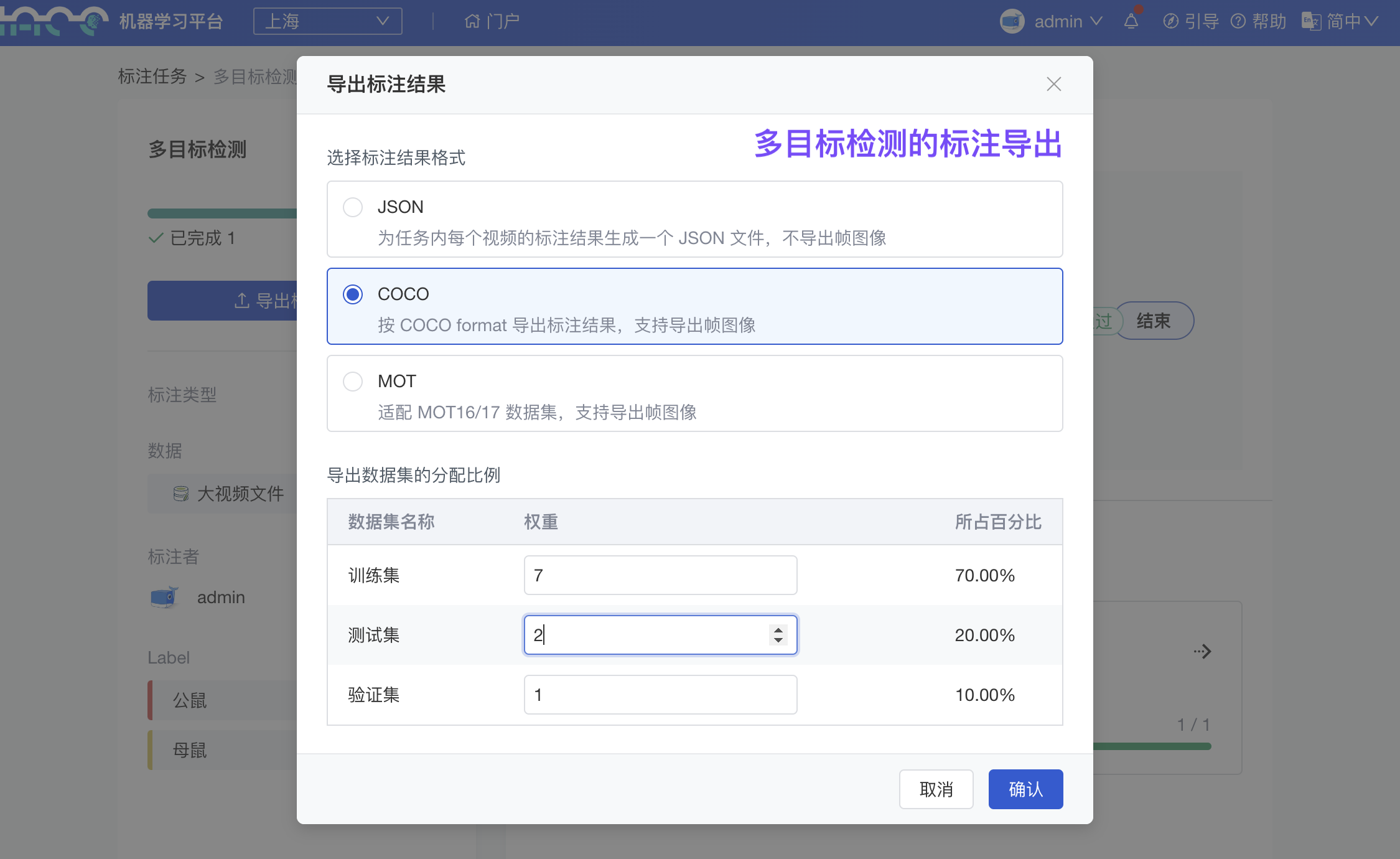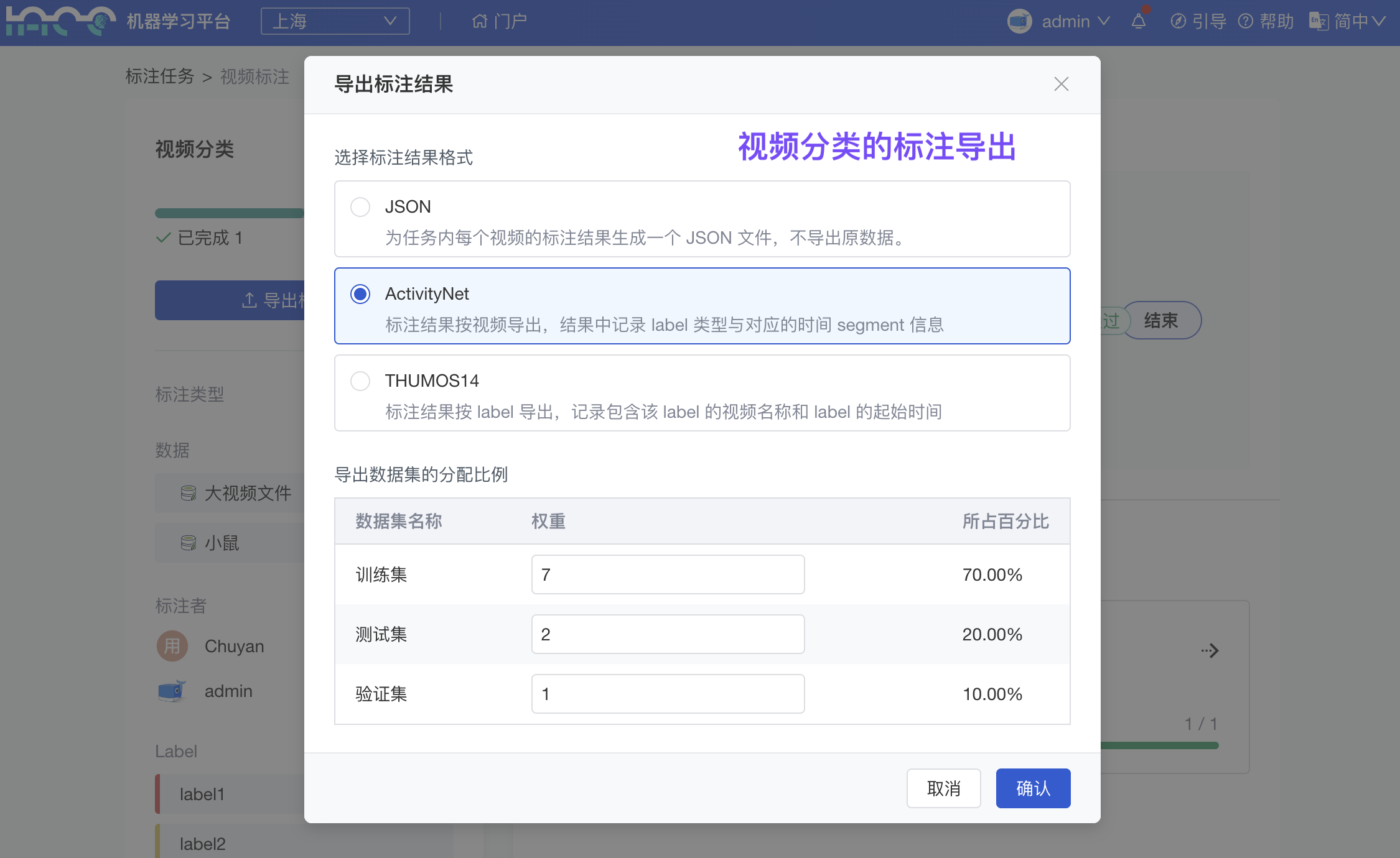 平台视频标注支持“视频分类”、“目标检测”、“姿态估计”的标注类型,标注后的数据结果现已均支持上述数据格式的转换。导出时,你还可以分配结果导出的数据集(“训练集”、“测试集”、“验证集”)的比例,更快完成模型输入数据的制作、切分。