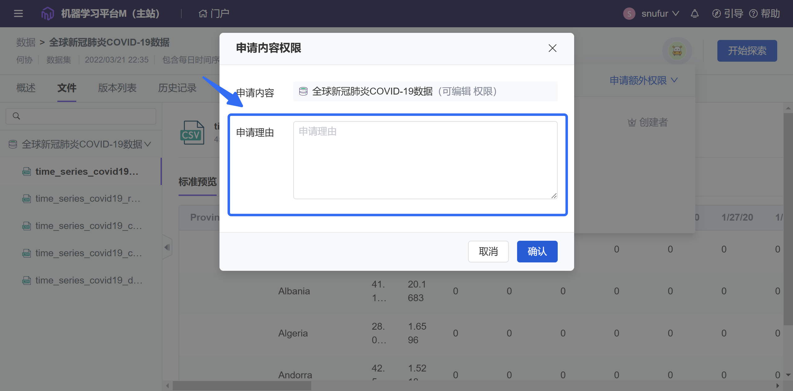 - 用户申请项目/数据集的访问权限或者更高级权限时,支持填写申请理由。