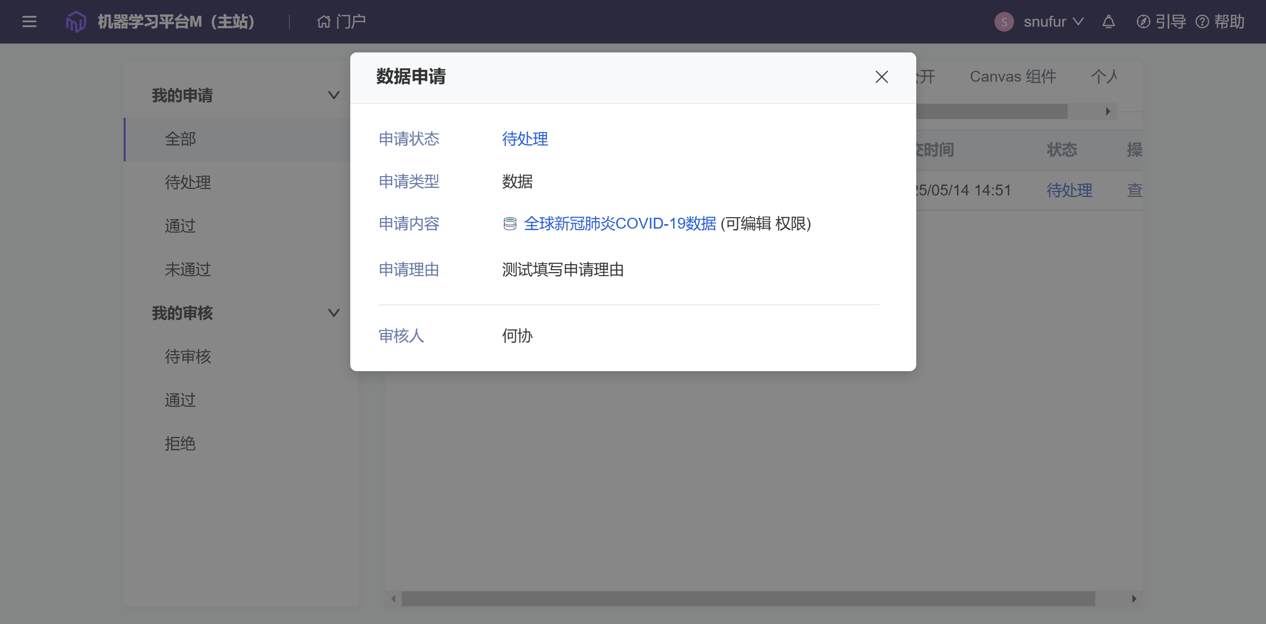 权限申请者和项目/数据创建者可在申请与审批中查看申请理由。