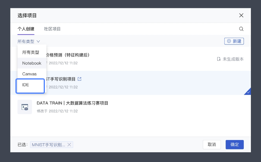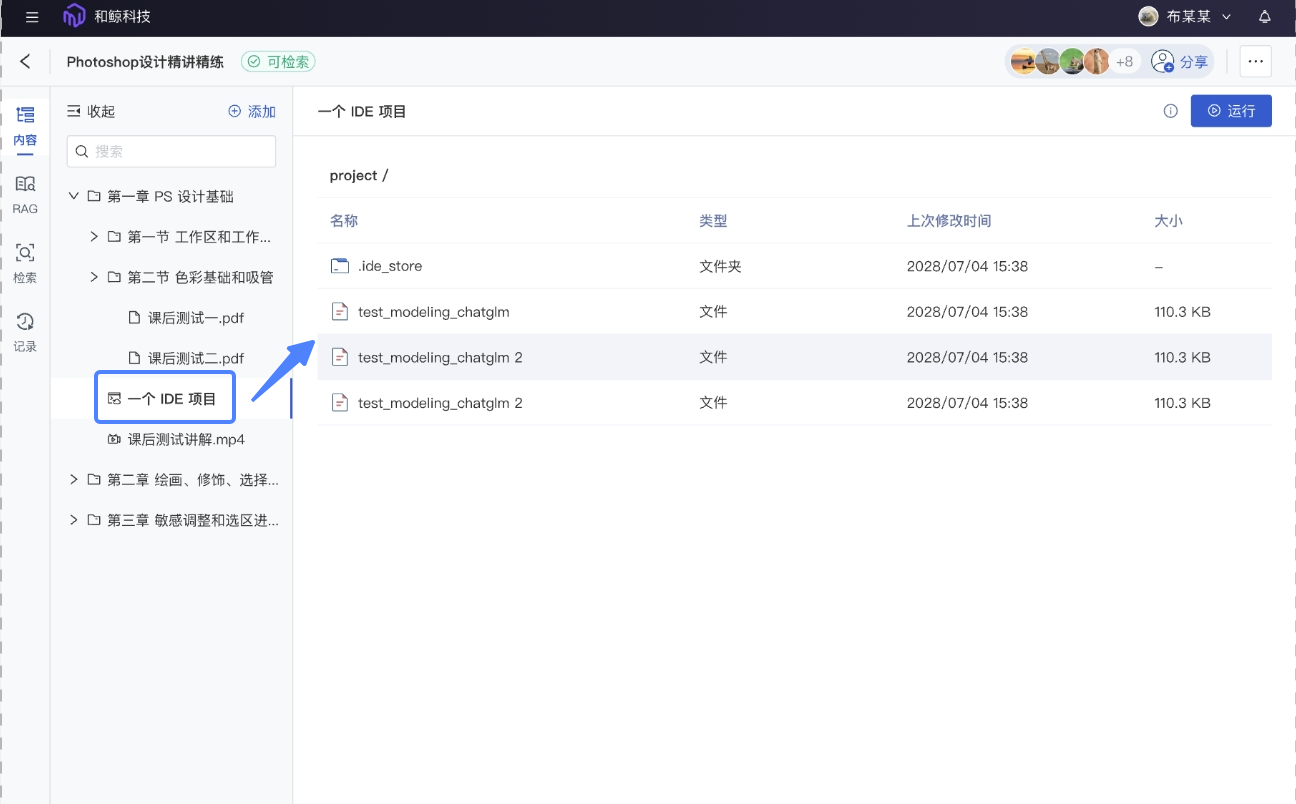 知识库内支持添加用户本人创建的IDE项目并可预览project目录。