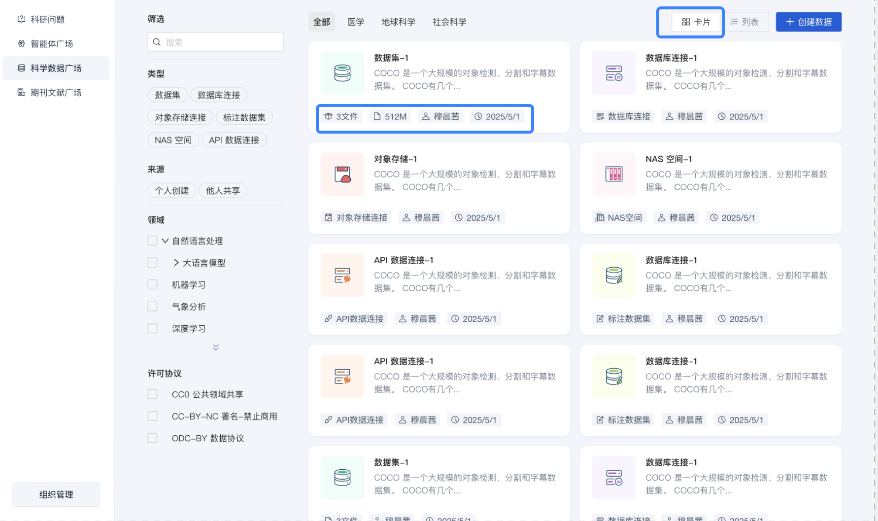 数据列表支持切换展示为卡片视图: