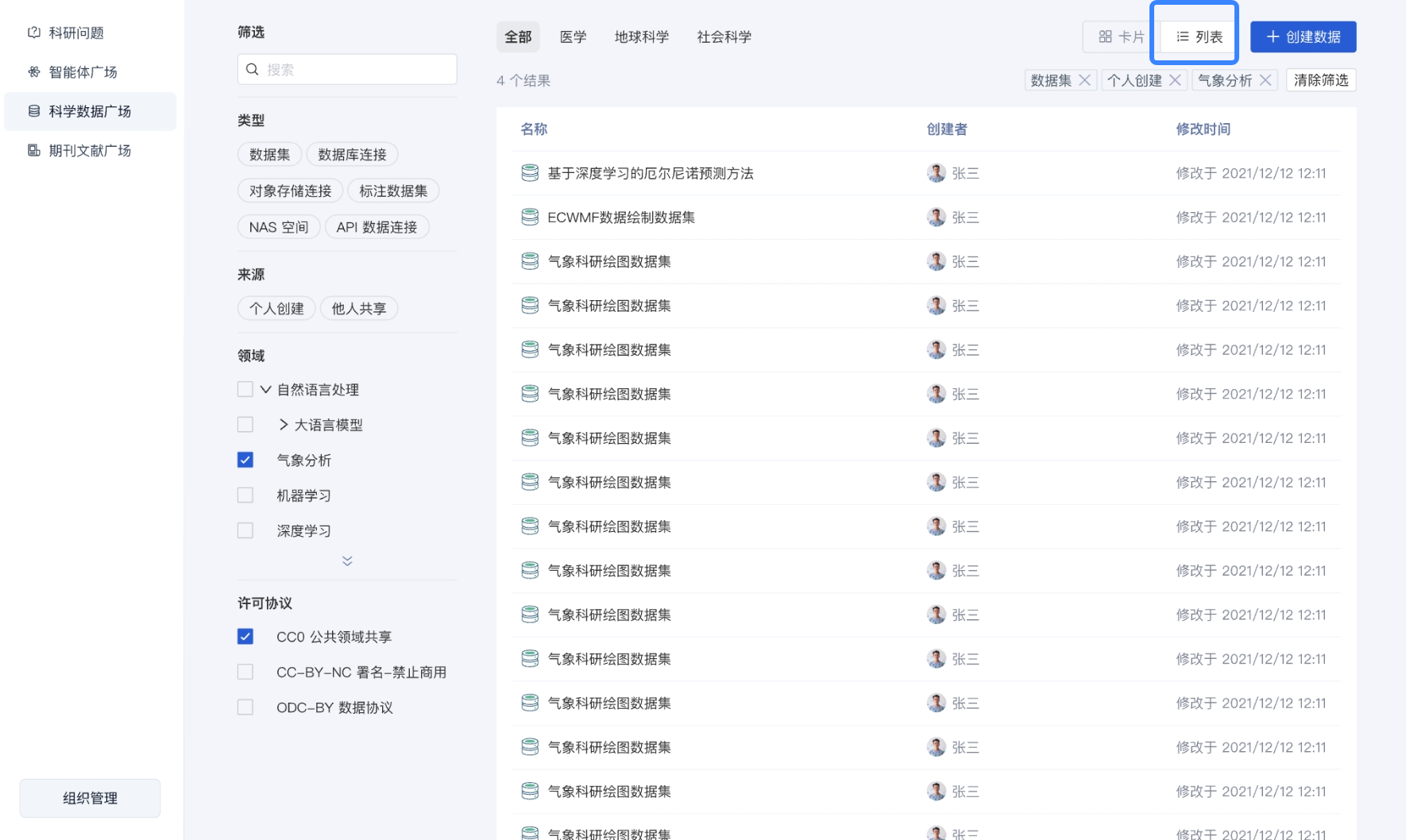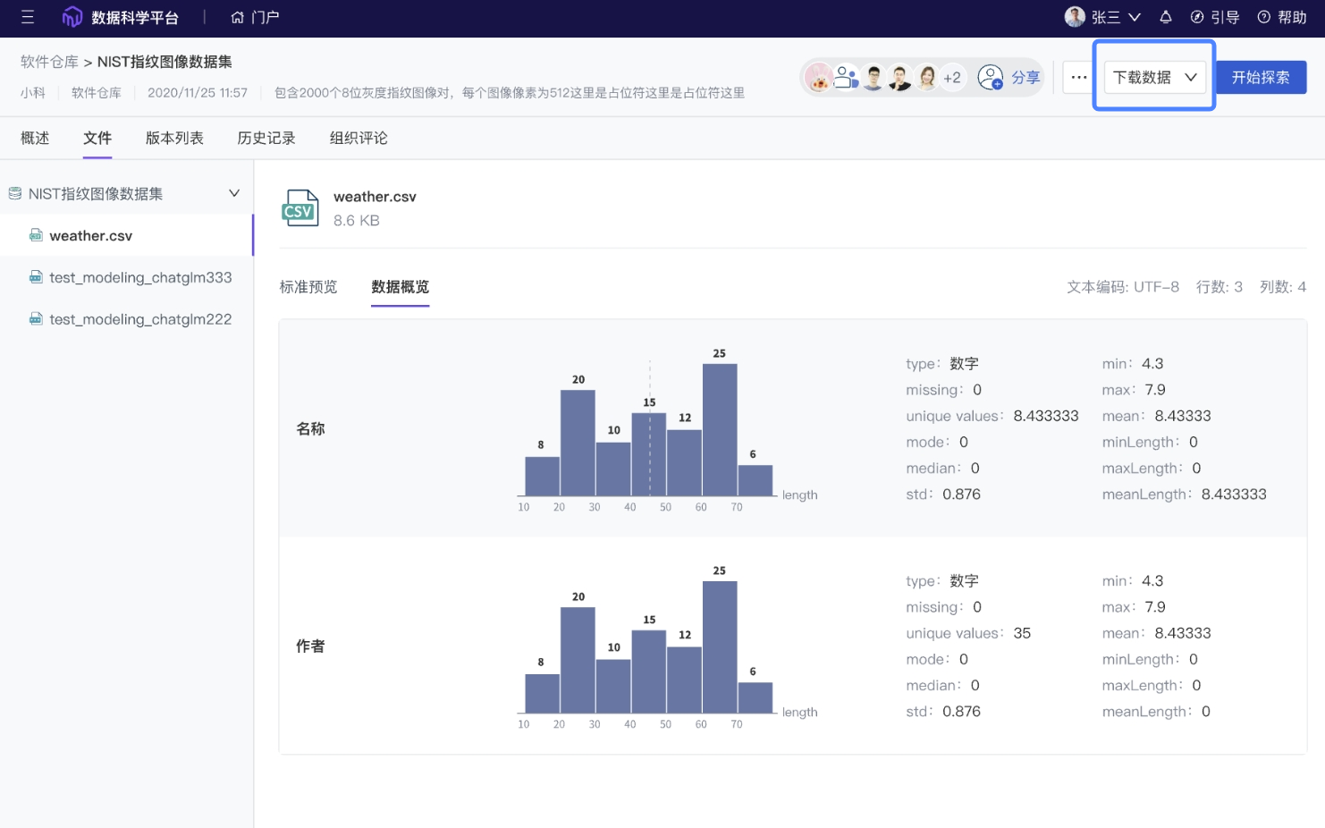 若数据为数据集,展示名称、短描述、作者、数据集内包含的文件数量、文件大小、修改时间;