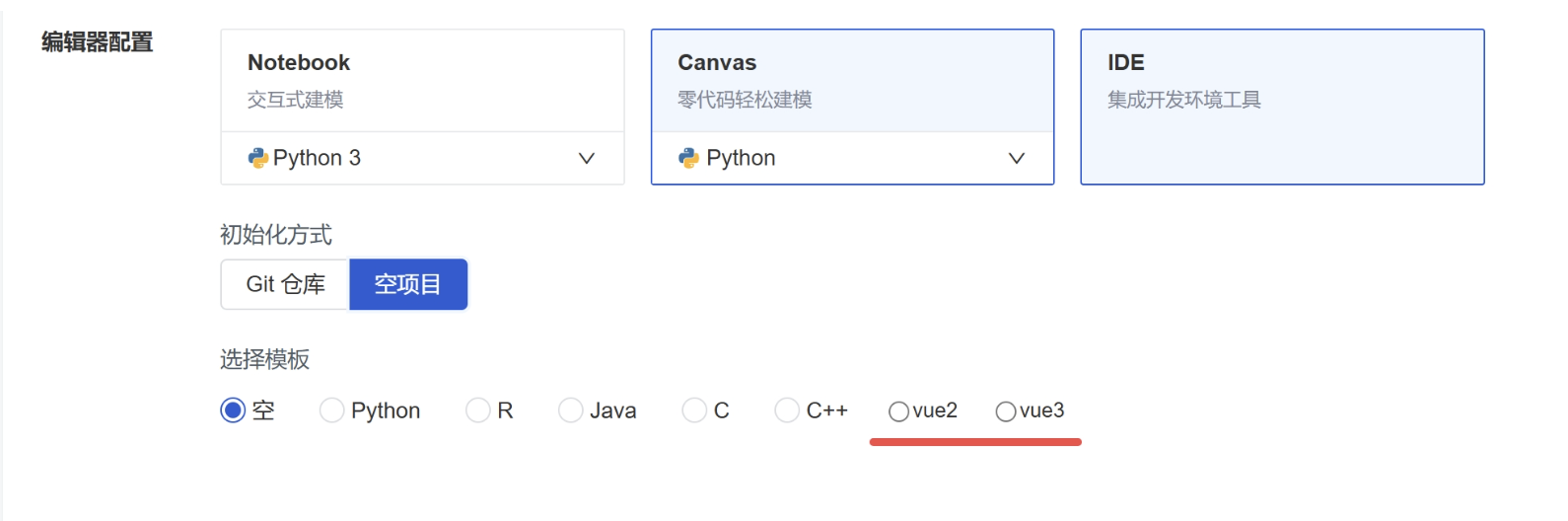 选择 vue2/vue3 模板,进入项目则包含 vue2/vue3 标准项目文件。